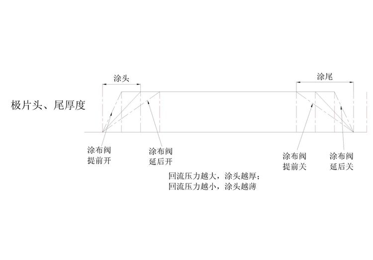 上圖情況是因為腔體壓力和回流壓力壓差太大,跳間隙料回流多了導致腔體壓力小,再啟涂時涂頭就薄了,解決方法:①關小些回流閥門讓涂布時腔體壓力與回流瞬間腔體壓力相持平或小于0.2就能保證頭部面密度與中間面密度一致的。
