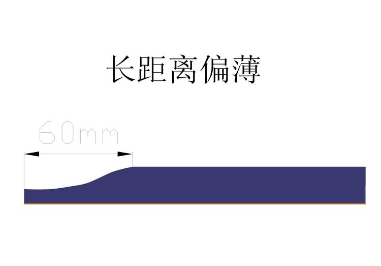 上圖情況是因為留白處的多余的漿料未能快速回流,即馬上要啟涂時多余的漿料在泊材與漿料接觸處會形成一個凸彎月面,彎月的曲率半徑越大,漿料下滴降過大會造成下彎月面不穩(wěn)定就會出現(xiàn)頭第一厚再薄再厚后正常如上圖所示情況。解決方法①更換薄墊片讓唇口彎月弧形變?、诩哟蠡亓鏖y芯內(nèi)徑尺寸讓漿料快速回流③調(diào)節(jié)間隙閥氣流增大讓閥打開速度快些。根據(jù)現(xiàn)場實際情況調(diào)節(jié)控制腔體壓力,回流壓力及間隙閥氣缸限流閥。